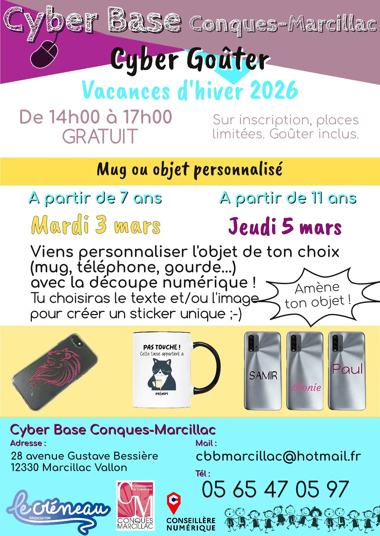 Cyber goûters : ateliers et goûter pour les enfants et adolescents.14h-17h, dès 7 ans, gratuit (goûter inclus). Cyberbase, Marcillac. Inscription obligatoire 05 65 47 05 97.
