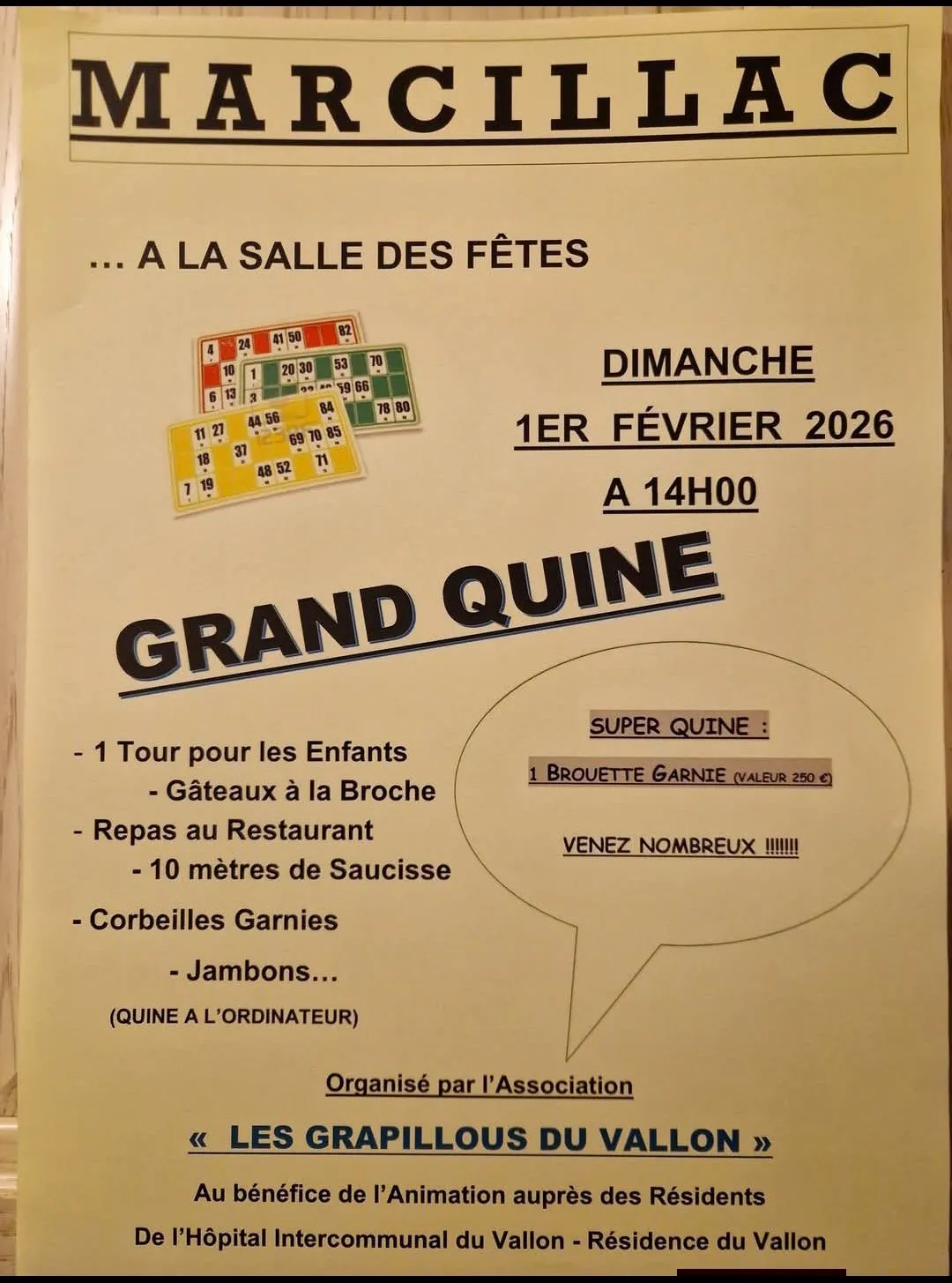Quine de l’association des Grapillous du Vallonn le dimanche 1er février à 14h, à la salle des fêtes de Marcillac.