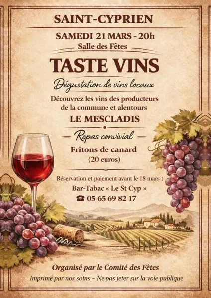 Repas et dégustation de vins à l’aveugle. 20h, à la salle des fêtes.