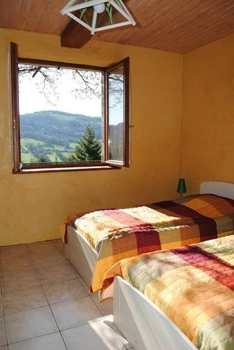 Dans la ferme familiale (belle vieille demeure), 2 grandes chambres indépendantes (5 / 6 personnes chacune) et table labellisées « Accueil Paysan », avec un joli point de vue sur la vallée boisée et calme. Sur la ferme de 20 ha, polyculture biologique avec 18 vaches et leurs veaux, poulets, lapins, légumes, fruits et confitures. Découverte de l’activité agricole.